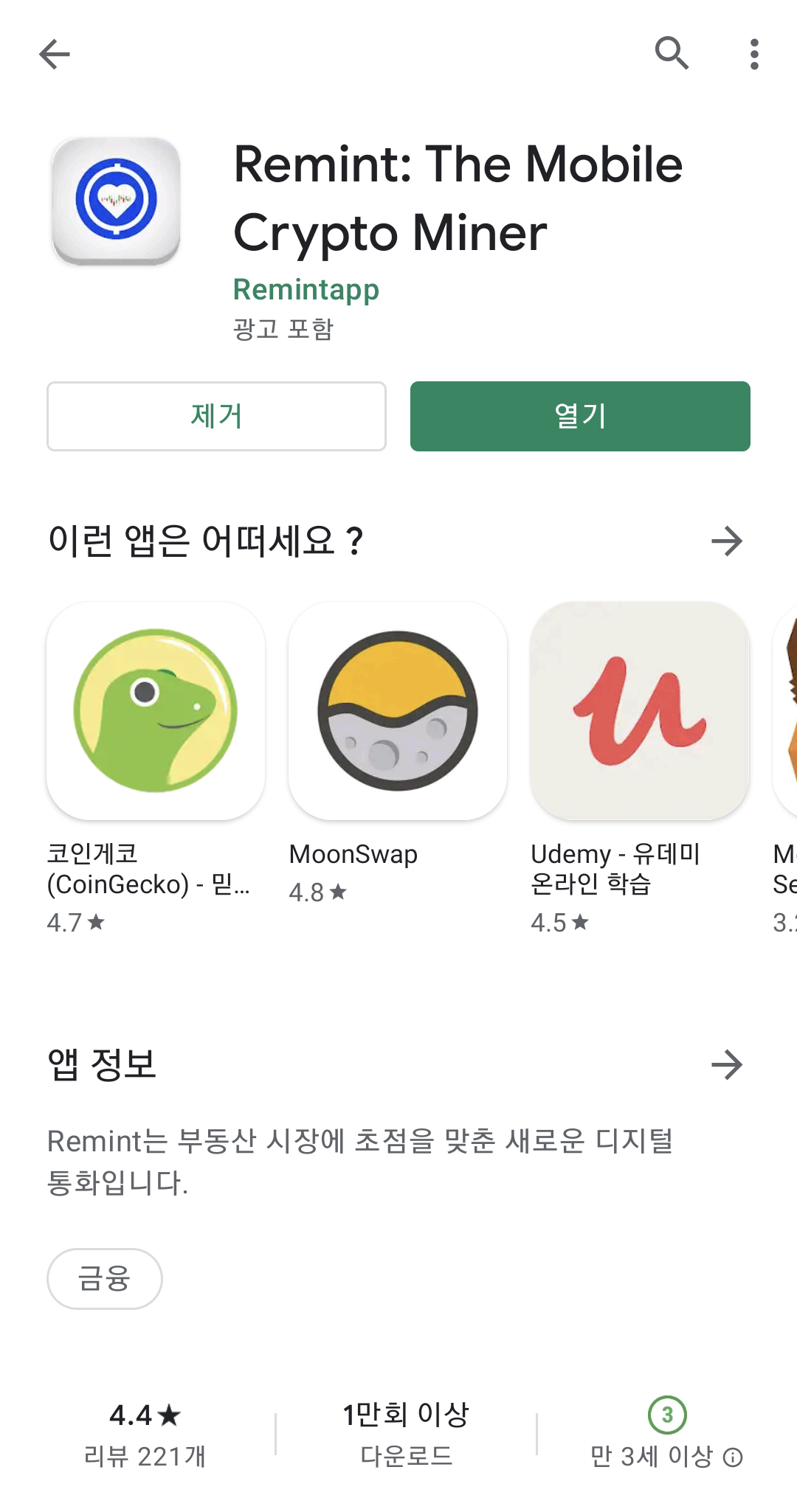 Remint는 스웨덴에서 2021년 4월 12일에 출시한 휴대폰 기반 채굴 앱 입니다.